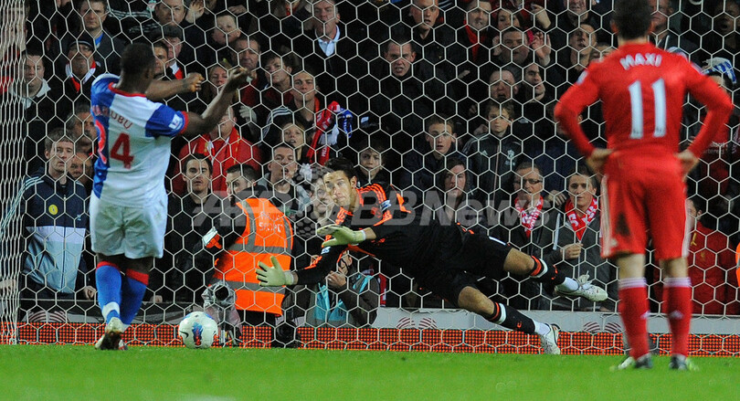 ブラックバーン・ローバーズのヤクブ・アイェグベニ(Yakubu Ayegbeni、左)のペナルティーキック(PK)をセーブするリバプールのGKブラッドリー・ジョーンズ(Bradley Jones、中央、2012年4月10日撮影)。(c)AFP/ANDREW YATES