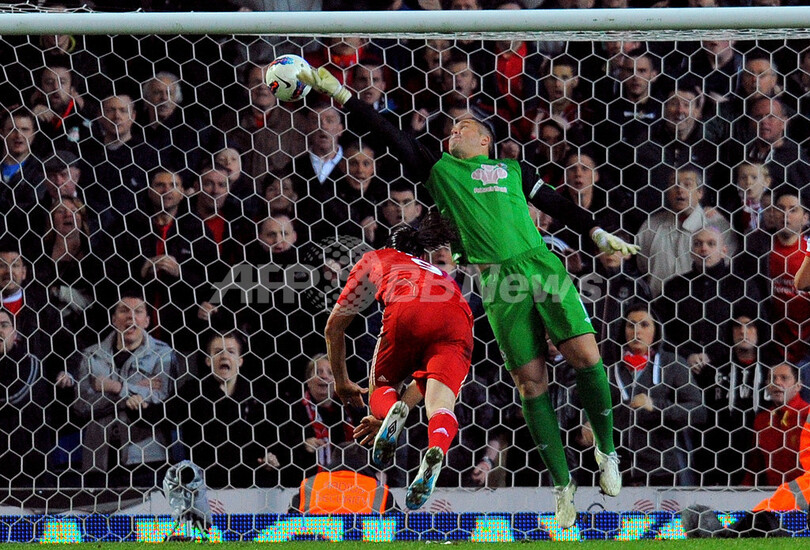 しかし、リバプールは試合終了間際にアンディ・キャロル(Andy Carroll)がヘディングで勝ち越しゴールを挙げた。(c)AFP/Neil Johnston