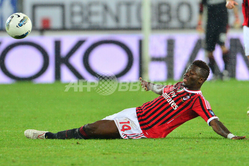 ボールを狙いスライディングするACミランのサリー・ムンタリ(Sulley Muntari、2012年4月10日撮影)。(c)AFP/GIUSEPPE CACACE