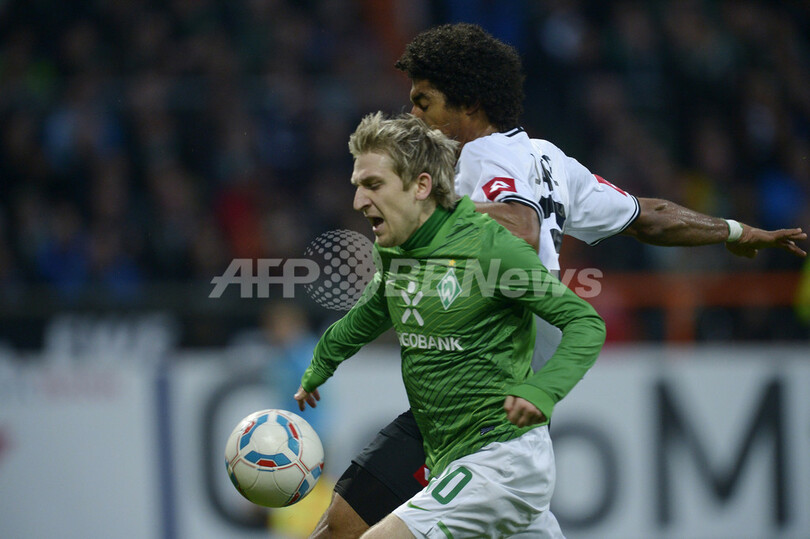 ヴェルダー・ブレーメンのマルコ・マリン(Marko Marin、前)とボールを競るボルシア・メンヘングラッドバッハのボンフィム・ダンテ(Dante Bonfim Costa Santos、2012年4月10日撮影)。(c)AFP/OLIVER HARDT
