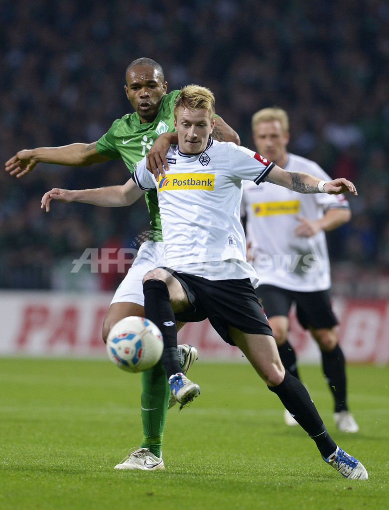 ヴェルダー・ブレーメンのナルド(Naldo、奥)とボールを競るボルシア・メンヘングラッドバッハのマルコ・ロイス(Marco Reus、2012年4月10日撮影)。(c)AFP/OLIVER HARDT