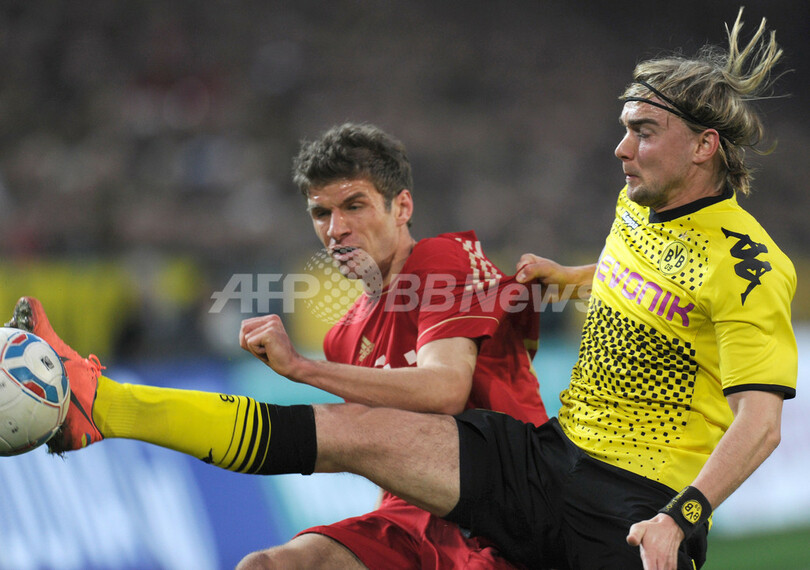バイエルン・ミュンヘンのトーマス・ミュラー(Thomas Mueller)とボールを競るボルシア・ドルトムントのマルセル・シュメルツァー(Marcel Schmelzer、2012年4月11日撮影)。(c)AFP/PATRIK STOLLARZ