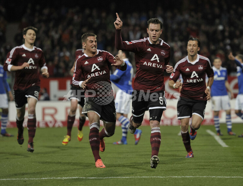 前半25分に先制点を挙げて歓喜するニュルンベルクのハノ・バリチュ(Hanno Balitsch、2012年4月11日撮影)。(c)AFP/GUENTER SCHIFFMANN