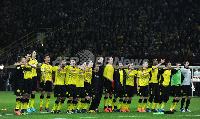 試合後に観衆へ挨拶するボルシア・ドルトムントの選手(2012年4月11日撮影)。(c)AFP/PATRIK STOLLARZ