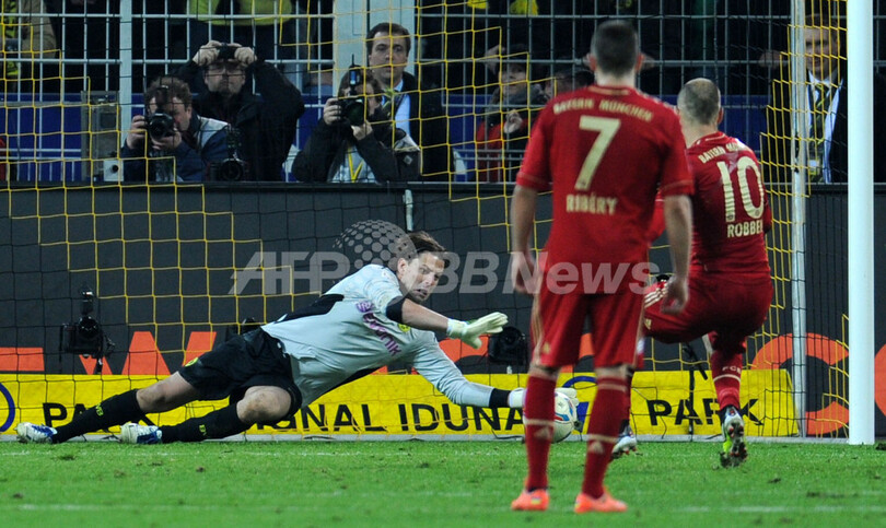 バイエルン・ミュンヘンのアリエン・ロッベン(Arjen Robben)のペナルティーキックを止めるボルシア・ドルトムントのGKロマン・ヴァイデンフェラー(Roman Weidenfeller、2012年4月11日撮影)。(c)AFP/PATRIK STOLLARZ