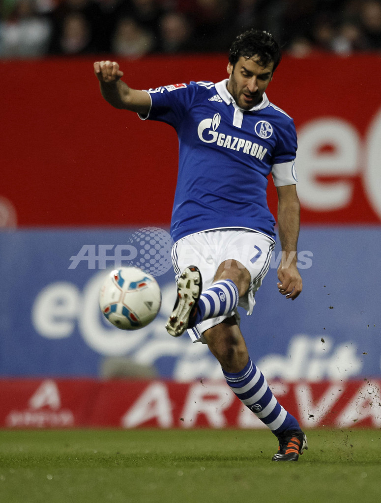 シュートを放つシャルケのラウル・ゴンザレス(Raul Gonzalez、2012年4月11日撮影)。(c)AFP/GUENTER SCHIFFMANN