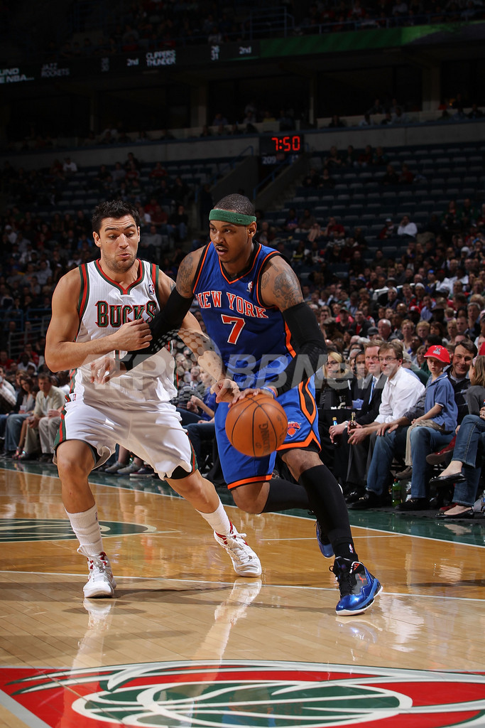 バックスのカルロス・デルフィノ(Carlos Delfino、左)をかわすニックスのカーメロ・アンソニー(Carmelo Anthony、2012年4月11日撮影)。(c)AFP/Getty Images/NBAE/Gary Dineen