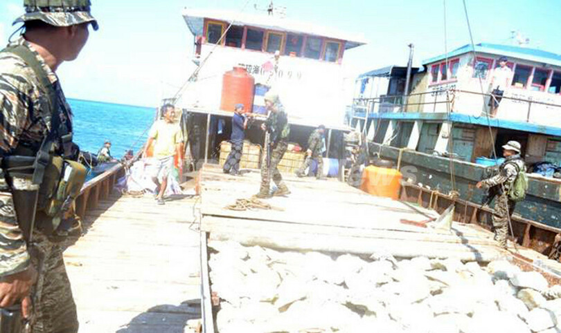 フィリピン海軍は最新鋭の艦船を現場に派遣し、中国人船員らの逮捕を試みたが、中国も10日になって監視船2隻を派遣し、フィリピン艦船による漁船への接近を阻止。フィリピン艦船と中国の監視船がたがいににらみ合い、両国政府が互いを非難しあう事態が続いていた。(c)AFP/Jason Gutierrez