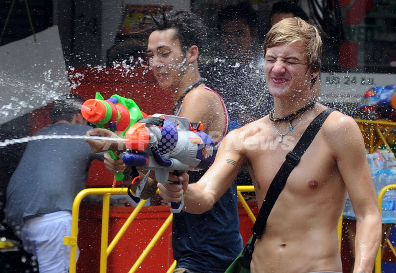 写真は、旅行者でにぎわうカオサン(Khao San)通りで、水を掛け合う地元の若者と外国人観光客(2012年4月12日撮影)。(c)AFP/PORNCHAI KITTIWONGSAKUL