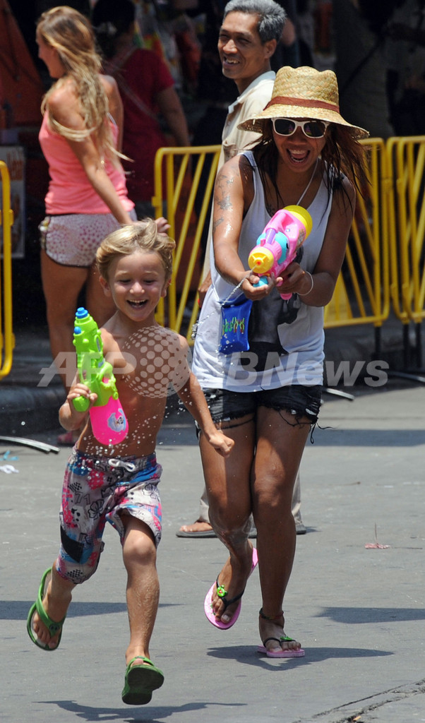 写真は、旅行者でにぎわうカオサン(Khao San)通りで、祭りに参加する外国人観光客ら(2012年4月12日撮影)。(c)AFP/PORNCHAI KITTIWONGSAKUL