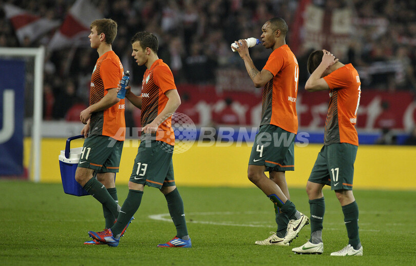 試合に敗れ落胆するヴェルダー・ブレーメン(Werder Bremen)の選手(2012年4月13日撮影)。(c)AFP/THOMAS KIENZLE