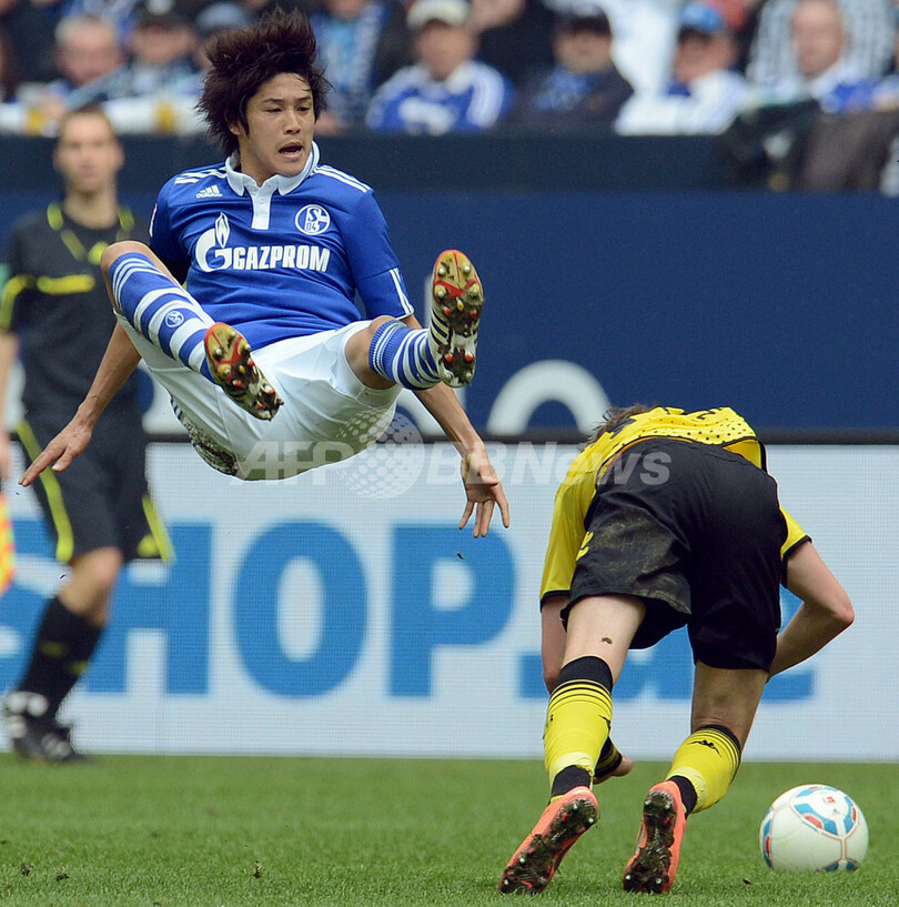 ボルシア・ドルトムントのスベン・ベンダー(Sven Bender)と競るシャルケの内田篤人(Atsuto Uchida、2012年4月14日撮影)。(c)AFP/PATRIK STOLLARZ