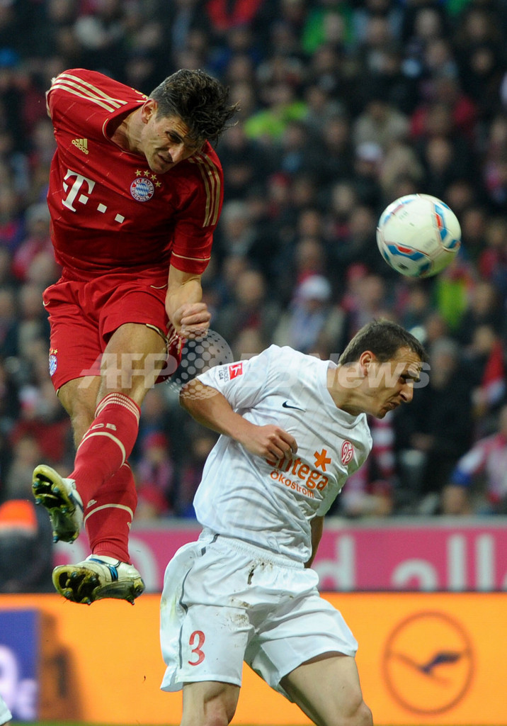 マインツのズデニェク・ポスピェフ(Zdenek Pospech)に競り勝ち、ボールをヘディングするバイエルン・ミュンヘンのマリオ・ゴメス(Mario Gomez、2012年4月14日撮影)。(c)AFP/CHRISTOF STACHE