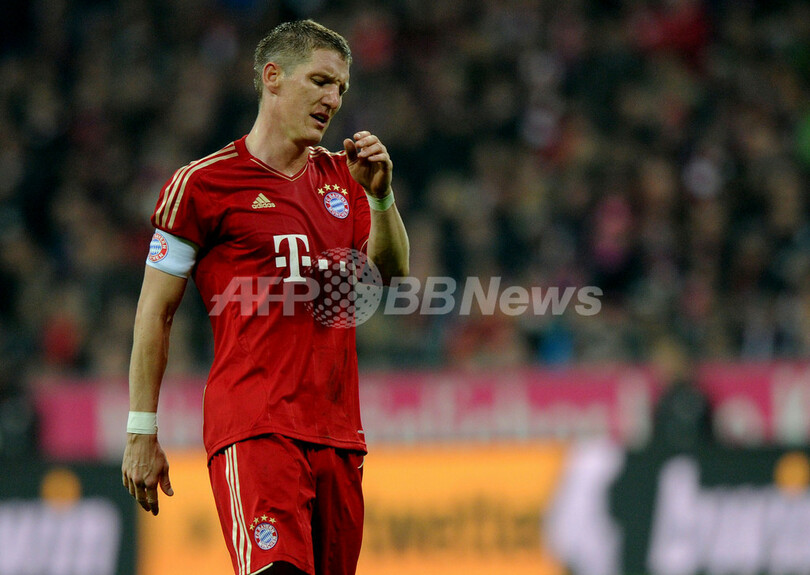 落胆した様子を見せるバイエルン・ミュンヘンのバスティアン・シュバインシュタイガー(Bastian Schweinsteiger、2012年4月14日撮影)。(c)AFP/CHRISTOF STACHE