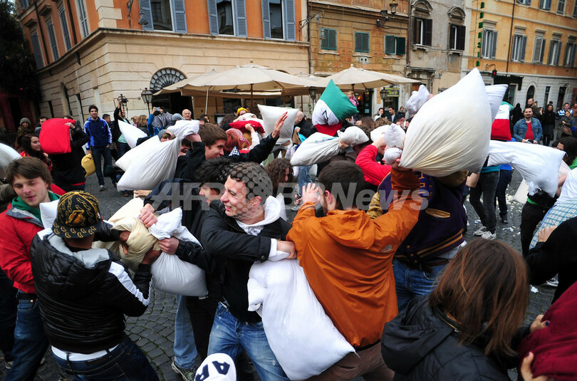 ローマでも「ピローファイト」、武器は羽根枕 イタリア