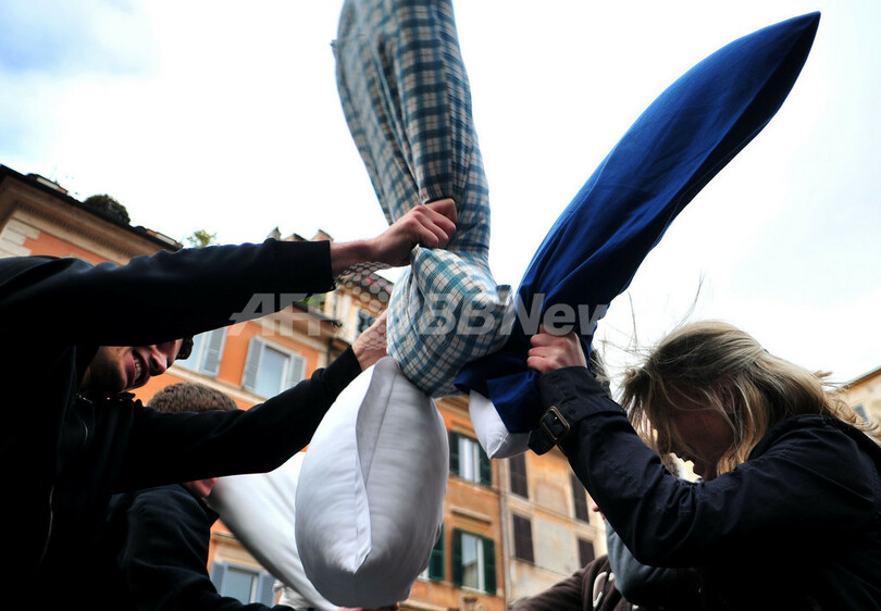 ローマでも「ピローファイト」、武器は羽根枕 イタリア