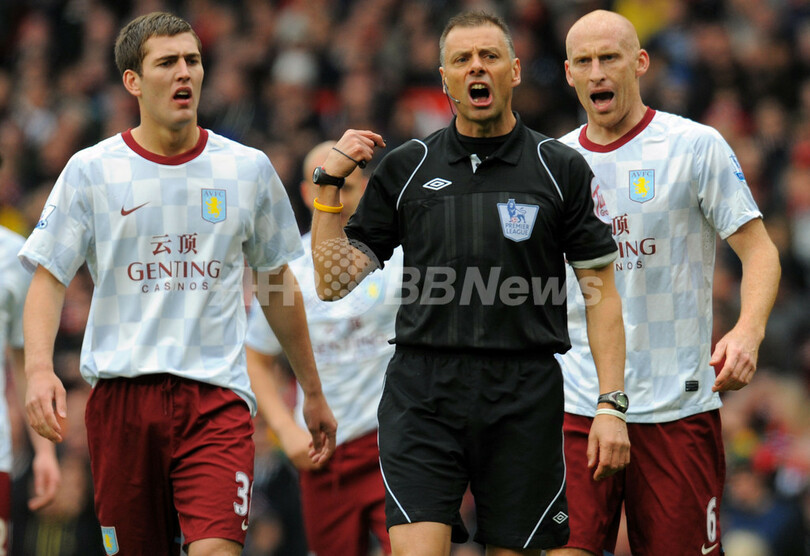 審判の判定に抗議するアストン・ビラのガーリー・ガードナー(Gary Gardner、左)とジェームズ・コリンズ(James Collins、2012年4月15日撮影)。(c)AFP/ANDREW YATES