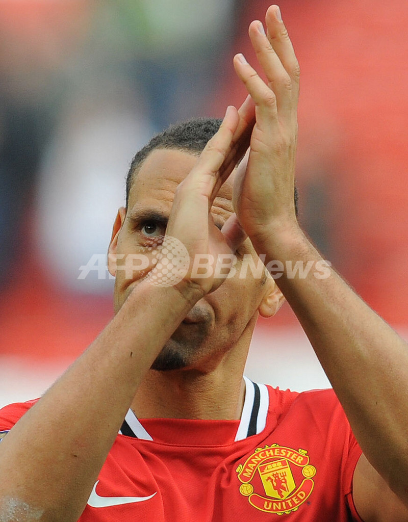 試合後、観衆の声援に応えるマンチェスター・ユナイテッドのリオ・ファーディナンド(Rio Ferdinand、2012年4月15日撮影)。(c)AFP/ANDREW YATES