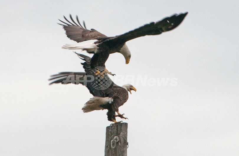 Vehicle Assembly Building)で14日、2羽のハクトウワシによる激しい場所取り争いが見られた。写真では、1羽が先にポールの先端にとまっていたところを、後から飛んで来たワシが奪おうとしている。(c)AFP