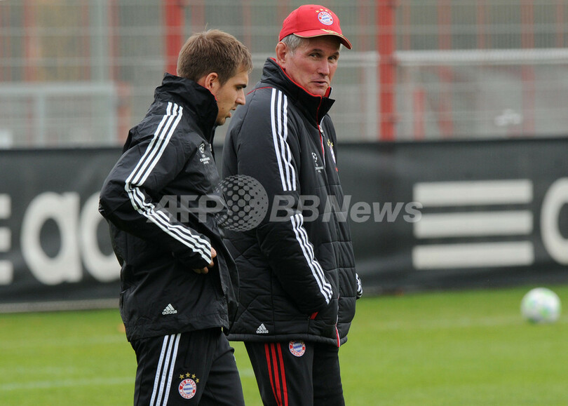 調整を行うフィリップ・ラーム(Philipp Lahm、左)と言葉を交わすバイエルン・ミュンヘンのユップ・ハインケス監督(Jupp Heynckes、2012年4月16日撮影)。(c)AFP/CHRISTOF STACHE