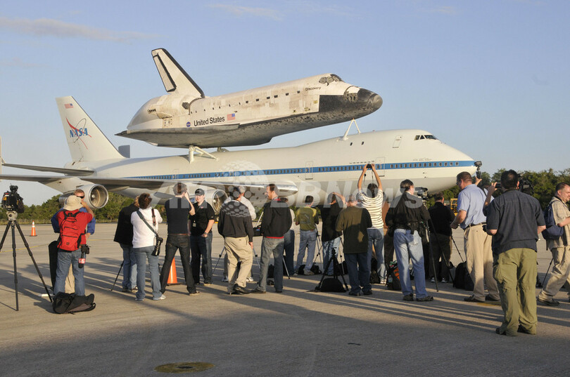 写真は、米フロリダ(Florida)州ケネディ宇宙センター(Kennedy Space Center)で、米航空宇宙局(NASA)の輸送機の上に載せられたスペースシャトル「ディスカバリー(Discovery)」を撮影する報道陣(2012年4月16日撮影)。(c)AFP/Bruce Weaver