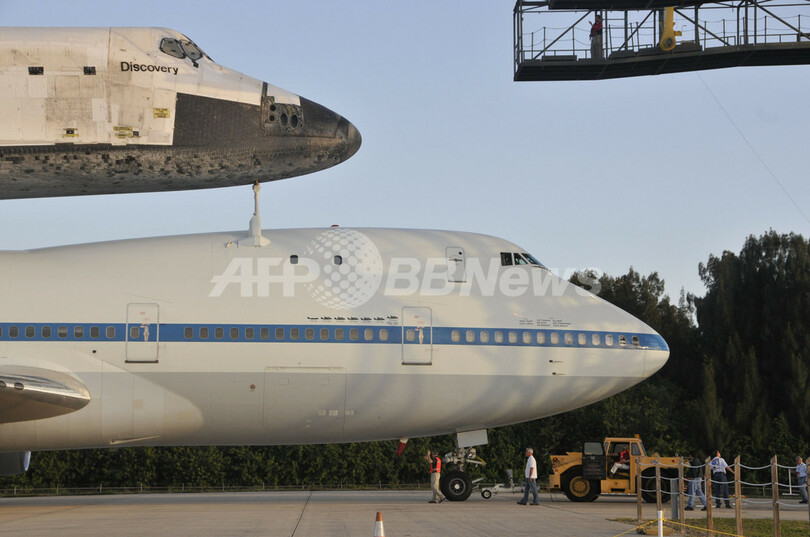 写真は、米フロリダ(Florida)州ケネディ宇宙センター(Kennedy Space Center)で、スペースシャトル「ディスカバリー(Discovery)」を載せて取り付け台から離れる米航空宇宙局(NASA)のスペースシャトル輸送機(2012年4月16日撮影)。(c)AFP/Bruce Weaver