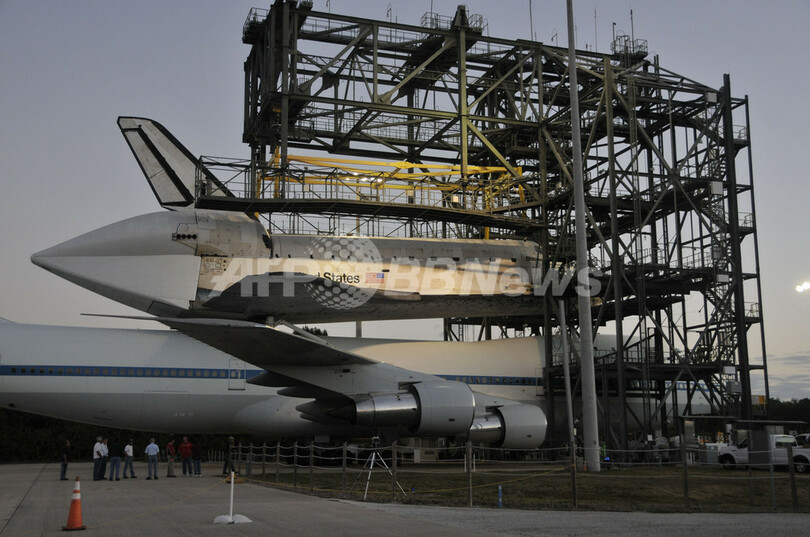 写真は、米フロリダ(Florida)州ケネディ宇宙センター(Kennedy Space Center)で、スペースシャトル「ディスカバリー(Discovery)」を載せて発進準備を行う米航空宇宙局(NASA)のスペースシャトル輸送機(2012年4月16日撮影)。(c)AFP/Bruce Weaver