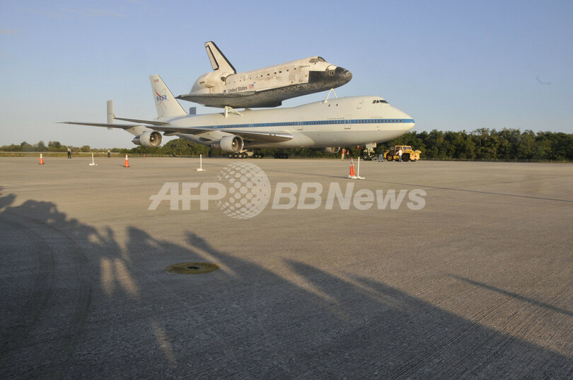 写真は、米フロリダ(Florida)州ケネディ宇宙センター(Kennedy Space Center)で、スペースシャトル「ディスカバリー(Discovery)」を載せて進む米航空宇宙局(NASA)のスペースシャトル輸送機(2012年4月16日撮影)。(c)AFP/Bruce Weaver