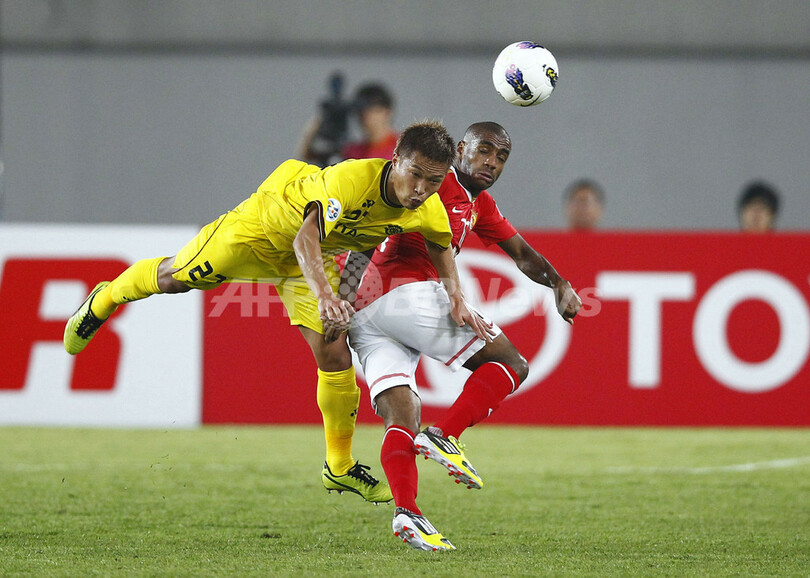 広州恒大のムリキ(Luiz Guilherme da Conceicao Silva 'Muriqui'、右)とボールを競る柏レイソルの藤田優人(Masato Fujita、2012年4月17日撮影)。(c)AFP