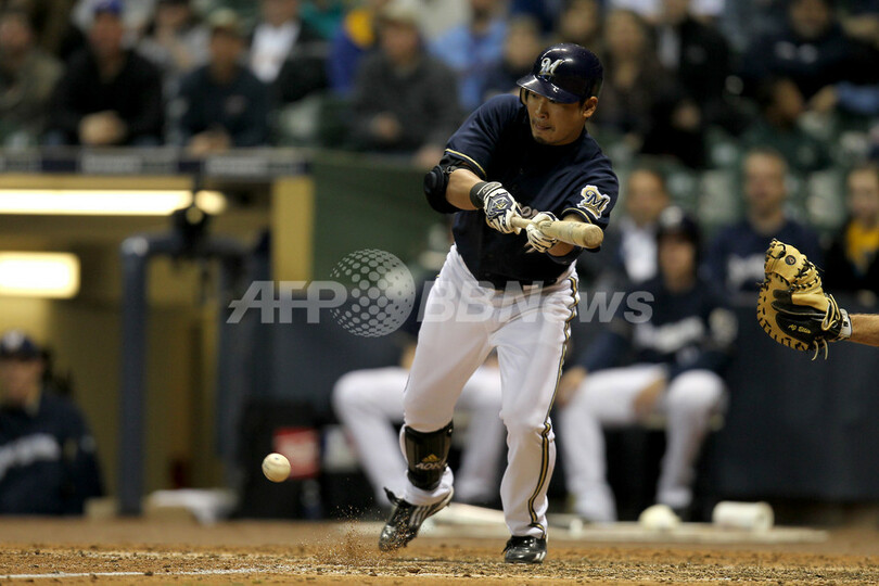 ブルワーズの青木宣親(Norichika Aoki)は7回に代打で出場し、スクイズを決め1打点を挙げた。(c)AFP