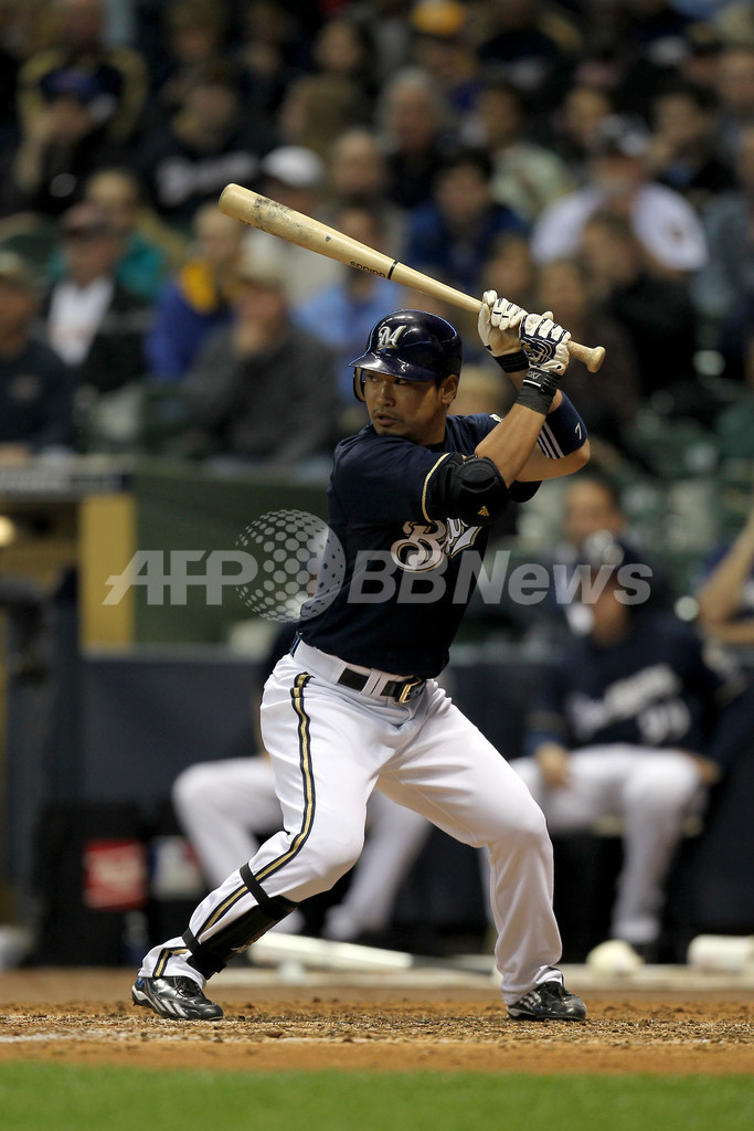 ブルワーズの青木宣親(Norichika Aoki)は7回に代打で出場し、スクイズを決め1打点を挙げた。(c)AFP