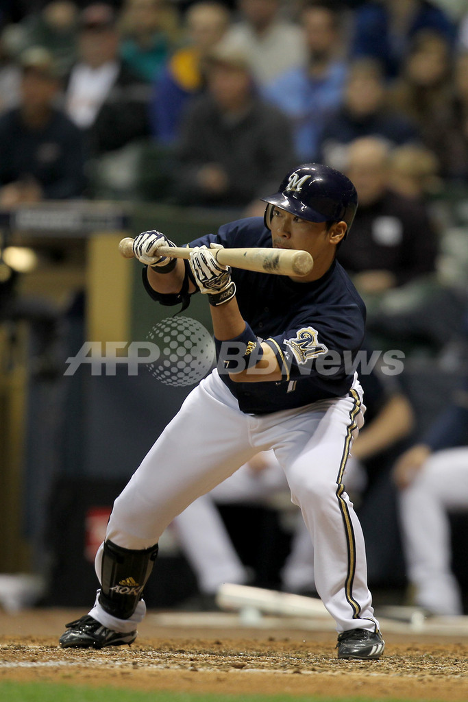 ブルワーズの青木宣親(Norichika Aoki)は7回に代打で出場し、スクイズを決め1打点を挙げた。(c)AFP