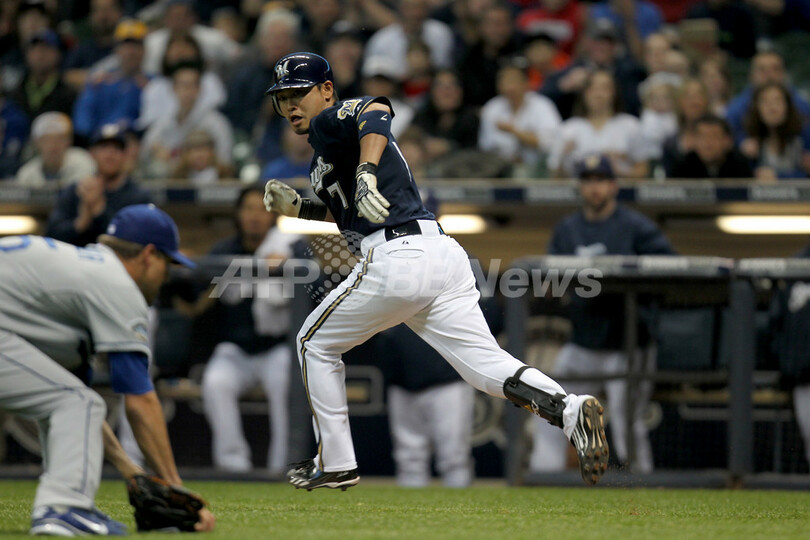 ブルワーズの青木宣親(Norichika Aoki)は7回に代打で出場し、スクイズを決め1打点を挙げた。(c)AFP