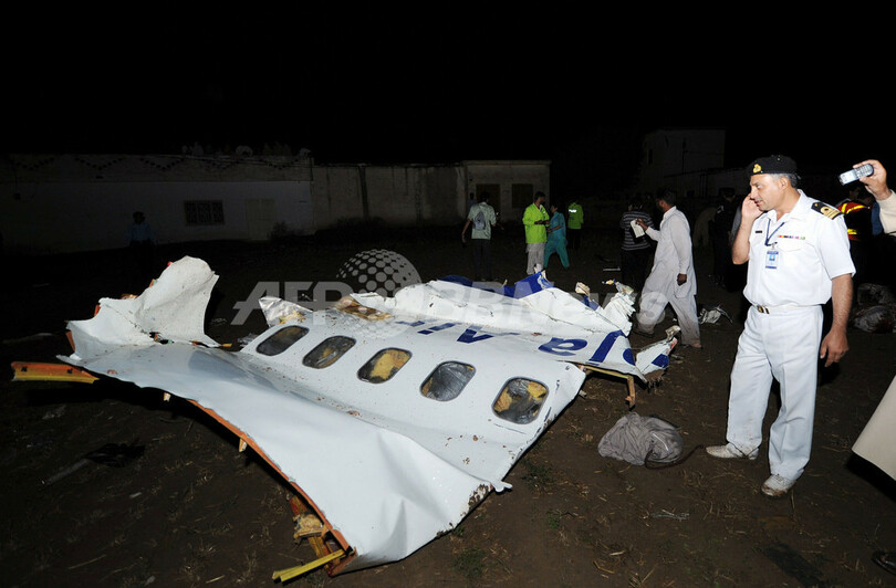 パキスタン海軍関係者は、旅客機は墜落当時、着陸のため滑走路に近づいていたと話し、「天候が非常に悪く、ひょうや激しい雷雨に見舞われていた。飛行機の操縦が困難になり、機体は地面に叩きつけられてはね返った後爆発し、火の玉となって墜落した」と説明した。(c)AFP/Khurram Shahzad