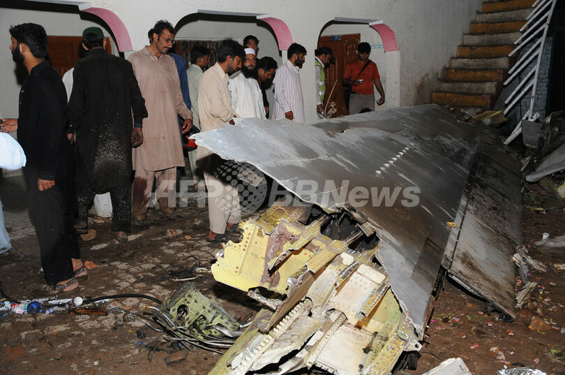 パキスタン海軍関係者は、旅客機は墜落当時、着陸のため滑走路に近づいていたと話し、「天候が非常に悪く、ひょうや激しい雷雨に見舞われていた。飛行機の操縦が困難になり、機体は地面に叩きつけられてはね返った後爆発し、火の玉となって墜落した」と説明した。(c)AFP/Khurram Shahzad