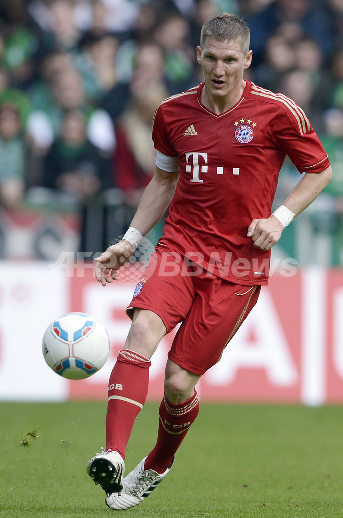 ボールをキープするバイエルン・ミュンヘンのバスティアン・シュバインシュタイガー(Bastian Schweinsteiger、2012年4月21日撮影)(c)AFP/OLIVER HARDT