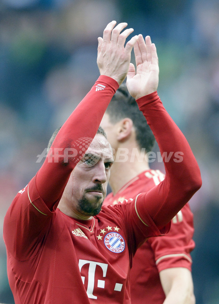 試合に勝利し、観衆の声援に応えるバイエルン・ミュンヘンのフランク・リベリ(Franck Ribery、2012年4月21日撮影)(c)AFP/OLIVER HARDT