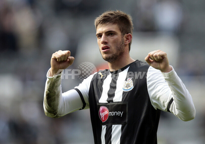 試合に勝利し歓喜するニューカッスルのダビデ・サントン(Davide Santon、2012年4月21日撮影)。(c)AFP/GRAHAM STUART