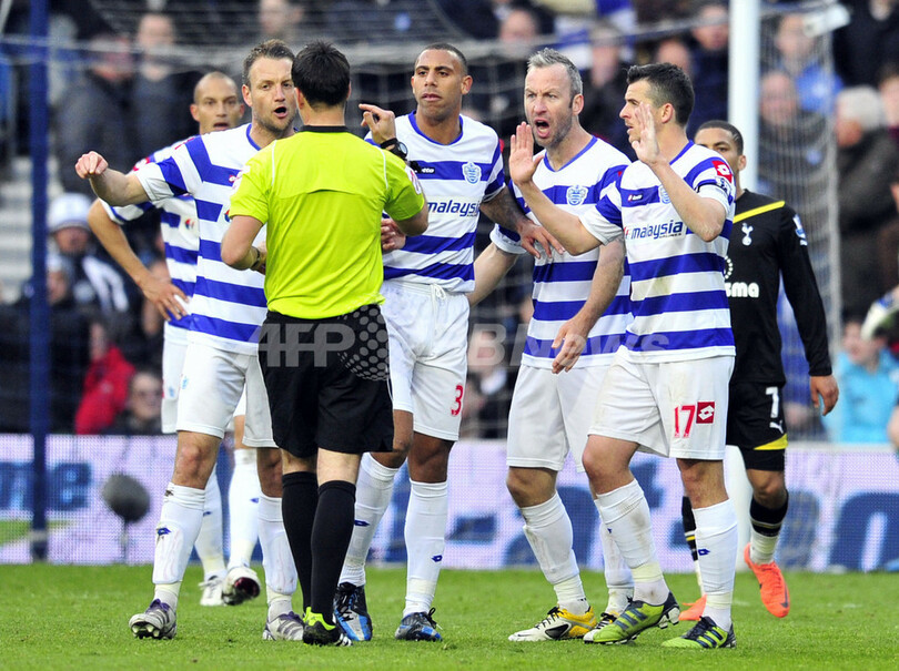 アデル・ターラブト(Adel Taarabt)を退場処分にした主審に抗議するQPRの選手(2012年4月21日撮影)。(c)AFP/GLYN KIRK