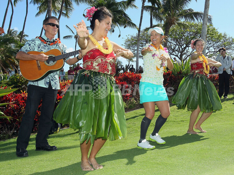 ホールアウト後、フラダンスを踊る宮里藍(2012年4月21日撮影)。(c)AFP/Getty Images/Jeff Gross