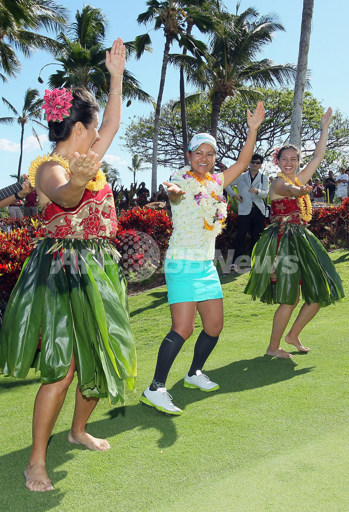 ホールアウト後、フラダンスを踊る宮里藍(2012年4月21日撮影)。(c)AFP/Getty Images/Jeff Gross