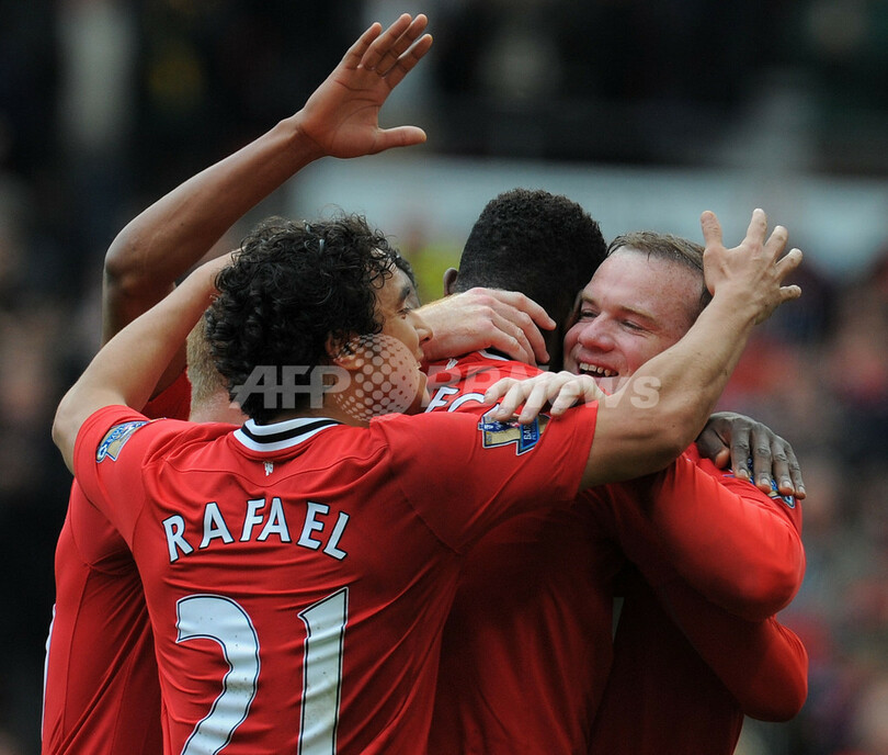 後半24分にチーム4得点目を挙げ、チームメイトに祝福されるマンチェスター・ユナイテッドのウェイン・ルーニー(Wayne Rooney、2012年4月22日撮影)。(c)AFP/ANDREW YATES