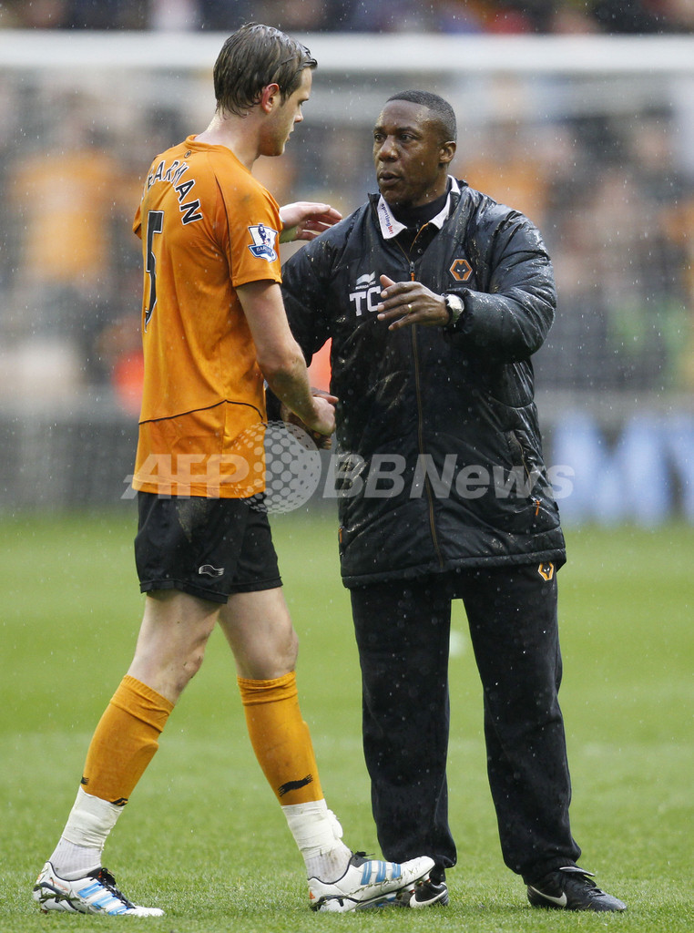 試合終了後、リチャード・ステアマン(Richard Stearman、左)と握手を交わすウォルバーハンプトン・ワンダラーズのテリー・コナー(Terry Connor)監督(2012年4月22日撮影)。(c)AFP/IAN KINGTON