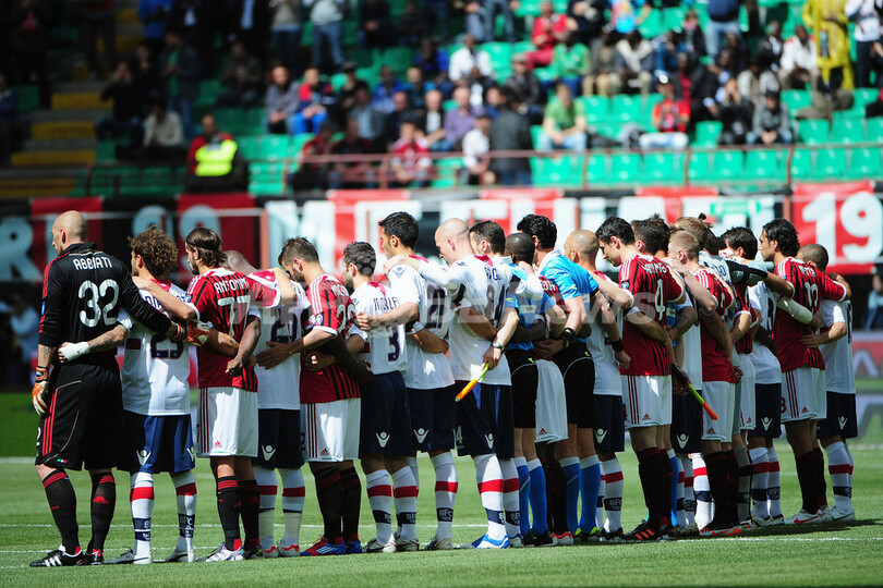 セリエBの試合中に亡くなったリボルノ(Livorno)のピエルマリオ・モロジーニ(Piermario Morosini)選手に黙祷を捧げるミランとボローニャの選手(2012年4月22日撮影)。(c)AFP/OLIVIER MORIN