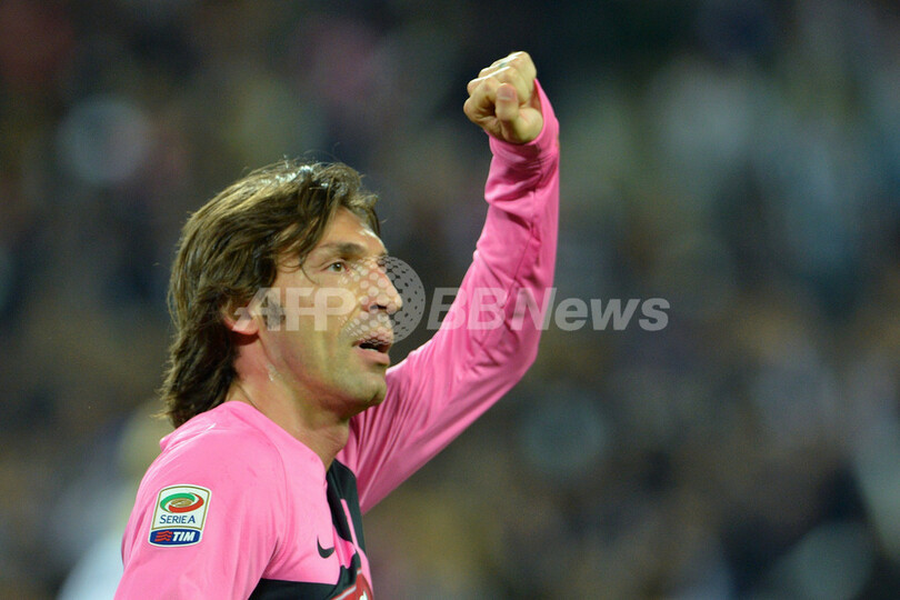 前半30分にチーム3得点目を挙げて歓喜するユベントスのクラウディオ・マルキジオ(Andrea Pirlo、2012年4月22日撮影)。(c)AFP/GIUSEPPE CACACE