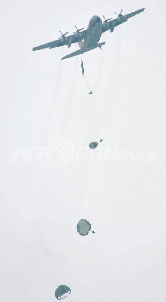 台湾北部で前週、空軍基地が中国から侵攻されたとの想定で訓練が行われた。訓練シナリオの専門家は、ミサイルやサイバー攻撃の時代であっても、このような想定には意味があると語った。写真は、侵攻してきた中国軍に扮(ふん)してC130輸送機からパラシュートで降下する空挺(くうてい)部隊(2012年4月19日撮影)。(c)AFP/Mandy CHENG