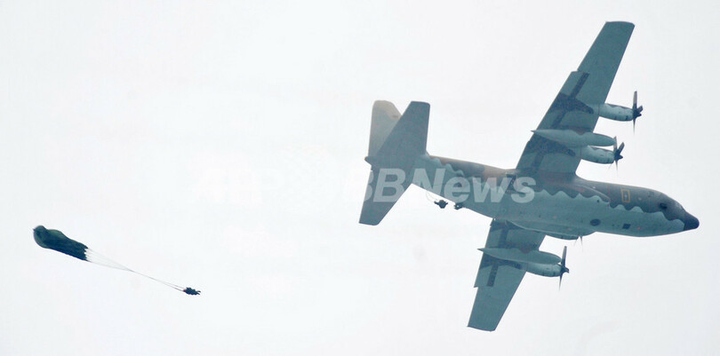台湾北部で前週、空軍基地が中国から侵攻されたとの想定で訓練が行われた。訓練シナリオの専門家は、ミサイルやサイバー攻撃の時代であっても、このような想定には意味があると語った。写真は、侵攻してきた中国軍に扮(ふん)してC130輸送機からパラシュートで降下する空挺(くうてい)部隊(2012年4月19日撮影)。(c)AFP/Mandy CHENG