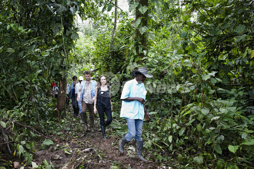 写真は、UNHCRが難民支援のために行う農業プロジェクトに携わる男性にジャングルを案内してもらうジョリーさん(2012年4月22日撮影)。(c)AFP/UNHCR/Jason TANNER