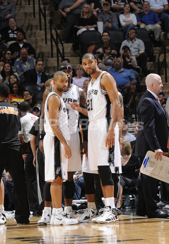 試合中に言葉を交わすサンアントニオ・スパーズのティム・ダンカン(Tim Duncan、右)とトニー・パーカー(Tony Parker、2012年4月23日撮影)。(c)AFP/Getty Images/NBAE/D. Clarke Evans