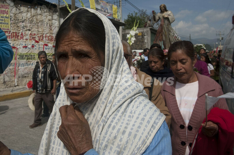 写真は、ポポカテペトル山に近いメキシコ中部プエブラ(Puebla)州Santiago Xalitxintlaで、「Senor de Las Misericordias」の像を行進しながら運ぶ住民ら(2012年4月21日撮影)。(c)AFP/Yuri CORTEZ